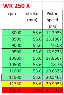 Dari data ini, menunjukka bahwa engine wr250x sangat cocok, jika tidak disebut “istimewa”, untuk dijadikan basis sport 250 cc satu silinder. Karena posisi power/torsi nya sudah berada pada rpm yang cukup tinggi, begitu pula dengan dayanya yang besar, bahkan sudah mendekati ninja 250 dua silinder. Dari data tsb dapat diprediksi variabel2 lainnya seperti VE, AFR dan piston speed-nya.