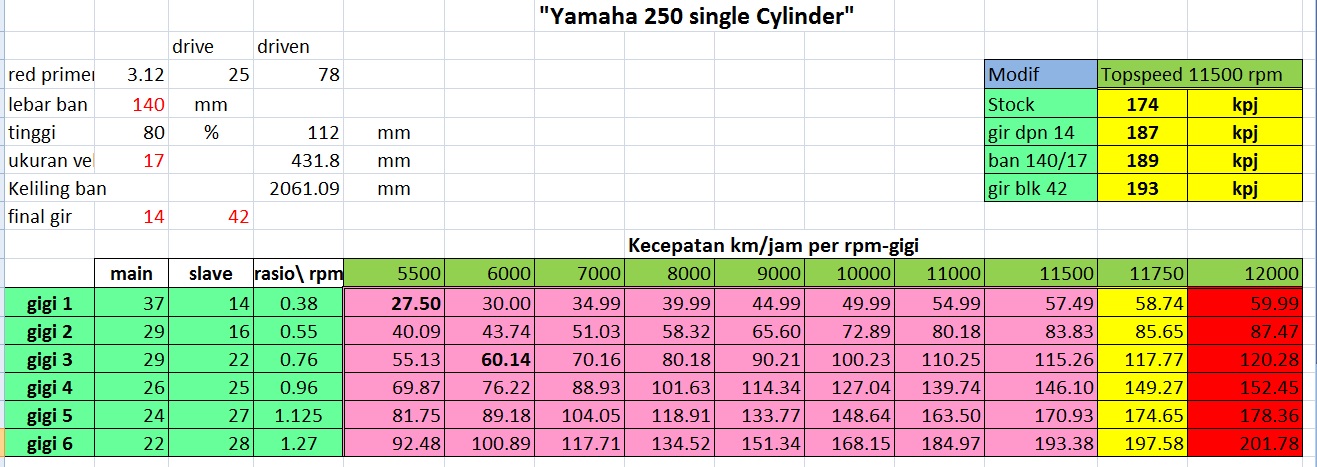 Terlihat memang, dari basic engine-nya, sudah sangat mumpuni. Akan tetapi jika ingin diterpkan sebagai basis yamaha 250 cc 2 silinder, ada baiknya CR diturunkan dari 11.8 menjadi 11, sehingga powernya menjadi 29.67 hp, ngak apa2 turun sedikit.