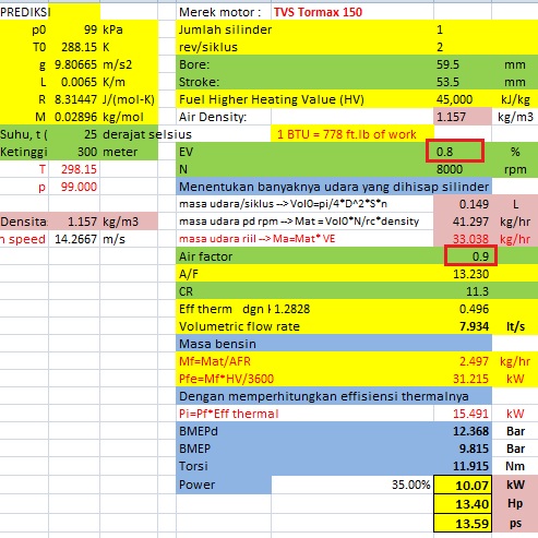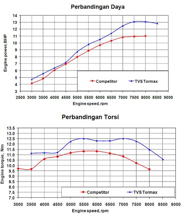Mengapa kurva yang dirancang menempatkan power puncak pada rpm yang rendah ? Hal inilah yang menjadi kelebihan TVS Tormax ini, yaitu dengan kombinasi torsi besar – rpm rendah – dan reduksi gigi yang berat menghasilkan motor yang kencang dan irit. Jadi wajar jika tenaganya cuma 13.4 hp, lha memang diperolehnya di rpm rendah 8000 rpm, dan lagi memang setinggannya dibuat irit. Mari kita tinjau variabel penentu power dari tormax.
