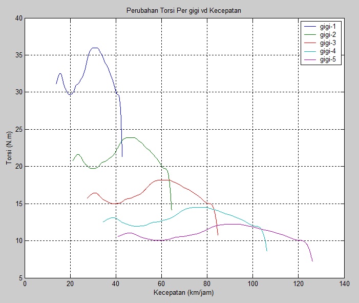 Dari grafik kurva torsi tersebut dapat diperoleh kurva torsi per gigi dan kecepatannya