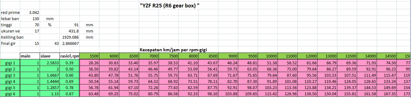 1. Dilihat dari bentuknya, YZF R25 mirip YZF R6 tahun 2008, sehingga bisa dimisalkan koefisien dragnya sama. Dan karena informasi tentang perbandingan girbok juga kita nggak tau, maka sebagai permisalan bisa menggunakan girbok nya R6, sementara reduksi primer, sekunder dan lingkar ban menggunakan R125. Dan menurut perhitungan “tanpa memperhatikan pwr dan koefisien drag” diperoleh topspeed per gigi-nya