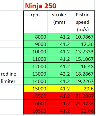 Yang pertama kita perhatikan adalah stroke-nya yaitu 41.2 mm, dengan stroke ini maka piston-speed maksimumnya (21 m/s) berada pada 15292 rpm, hmmm tinggi banget ya. Artinya pistonnya masih aman jika putaran mesin di-upgrade sampai 15000 rpm, akan tetapi belum tentu dengan komponen lainnya seperti klep, per klep, bos klep, noken as, bearing2 dll.