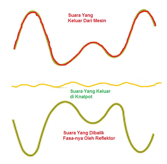 Dalam gambar di atas terlihat bahwa saat masuk aliran gas bersama gelombang suara mengalir dalam jumlah besar. Setelah melewati muffler, aliran gas buang tetap besar, sedangkan gelombang usaranya sangat minim, jadi tidak mengganggu performa engine, sementara suara yang dihasilkan minim. Hal in berkat teknik sound cacellation yang diterapkan dalam konstruksi mufflernya, yang mana metode ini dapat dengan sederhana dijelaskan dalam gambar ini.