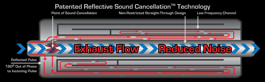Dalam gambar di atas terlihat bahwa saat masuk aliran gas bersama gelombang suara mengalir dalam jumlah besar. Setelah melewati muffler, aliran gas buang tetap besar, sedangkan gelombang usaranya sangat minim, jadi tidak mengganggu performa engine, sementara suara yang dihasilkan minim. Hal in berkat teknik sound cacellation yang diterapkan dalam konstruksi mufflernya, yang mana metode ini dapat dengan sederhana dijelaskan dalam gambar ini.