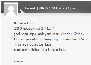 Ok, ane mau mengklarifikasi mengenai ketidak tepatan perhitungan yang sempet ane rulis dalam artikel knalpot z250, perhatikan cuplikan berikut