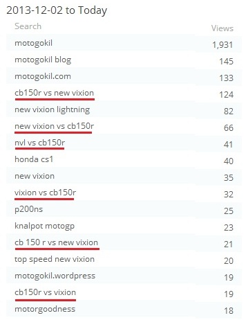 Ternyata sama juga bro, topik mengenai new vixion lightning dan cb150r tetap menduduki rangking teratas. Tapi ada sedikit variasi, yaitu terlihatnya topik mengenai bajaj pulsar p200ns yang sempat hangat pada pertengahan tahun 2013. Yang cukup membuat ane senang adalah, adanya topik mengenai “noken as” yang juga sempat menjadi pembicaraan. Artinya masih ada kepedulin terhadap hal2 (artikel) yang mampu memberikan pencerahan dan pencerdasan otomotif bagi kita semua.