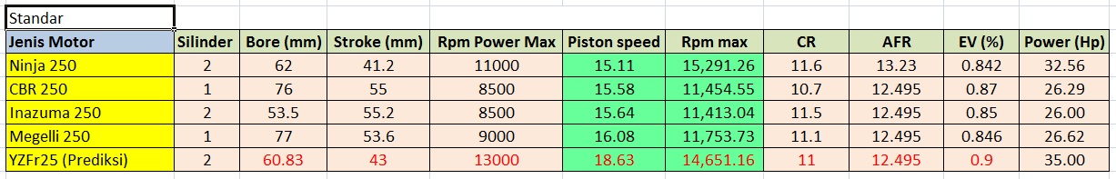 Dari variabel2 ini bisa digambarkan perbandingan performa motor 250 cc, seperti tampak pada tabel berikut