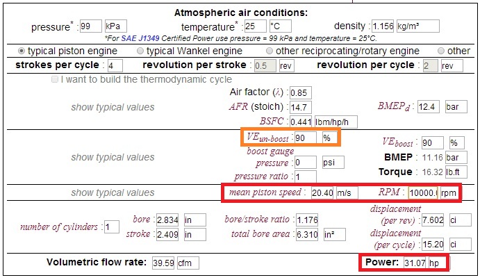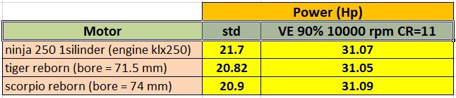 Begitu pula dengan scorpio rebon 250 cc, jika CR = 11 dan peak powernya di 10000 rpm, maka powernya menjadi 29.37 hp