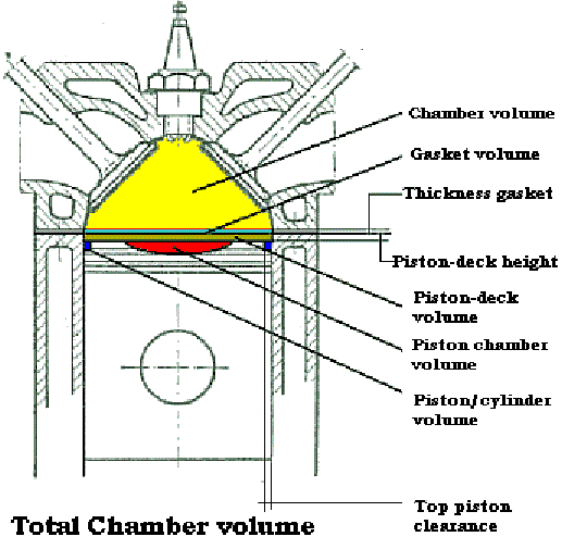 Selain ada payung klep , yang bisa kita lihat, kalau kita berada dalam silinder , kita akan melihat kubah (dome), diameter, kedalaman (stroke), squish, deck clearence dll. Selama ini biasanya kita hanya tahu bahwa dari ukuran volume ruang bakar dan ukuran silinder, bisa diperoleh rasio kompresi / compression ratio (CR), seperti tampak pada gambar berikut.