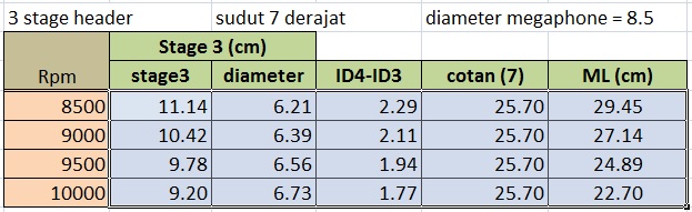 Jika megaphone, dirancang pada header 2 stage, misalnya dipilih sudut 7 derajat dengan diameter megaphone = 8.5 cm, maka panjang megaphone untuk rpm yang dipilih :