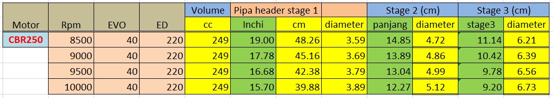 Tinggal pilih, mau dioptimalkan di rpm berapa power puncaknya. Setelah itu baru dirancang moncong knalpotnya, apakah ingin dibuat megaphon seperti motogp, atau tetep dipasangi silencer. Sedangkan jika ingin tidak kehilangan torsinya di rpm rendah, maka pipa header bisa ditambah secara bertingkat (jadi 3 stage), dengan menggunakan persamaan yang ada di artikel ini.