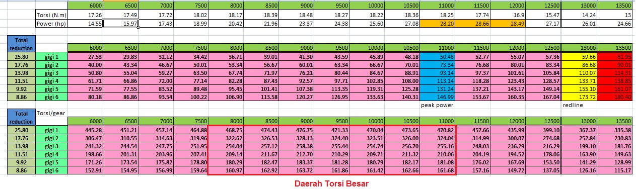 Bisa dilihat dari tabel di atas, jika shiftingnya tepat maka torsi malah bisa naik dan kalaupun turun, tutunnya cuma sedikit sekita 11%. Oya caranya mendapatkan isian tabel di atas bisa mengacu pada gambar berikut