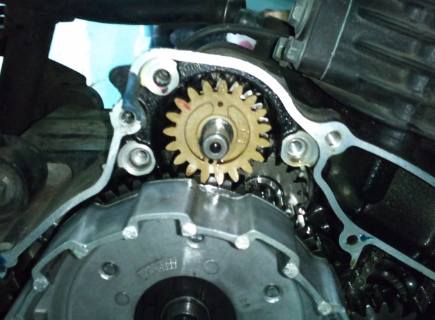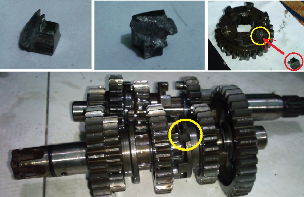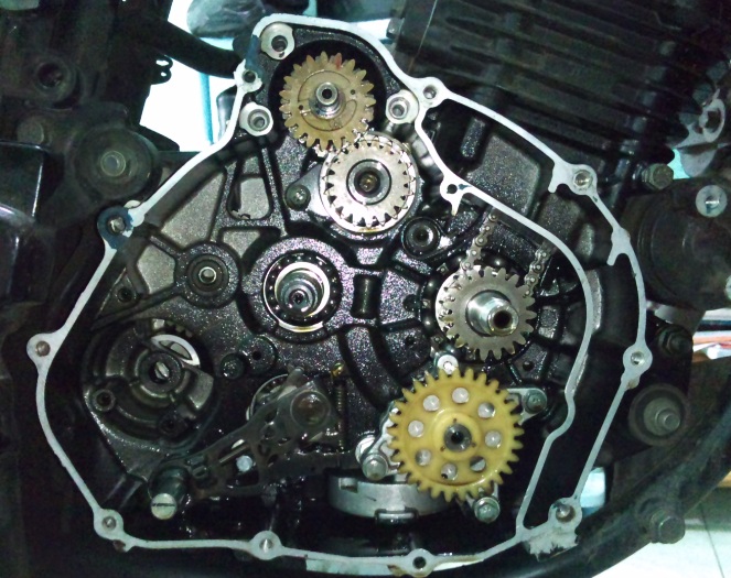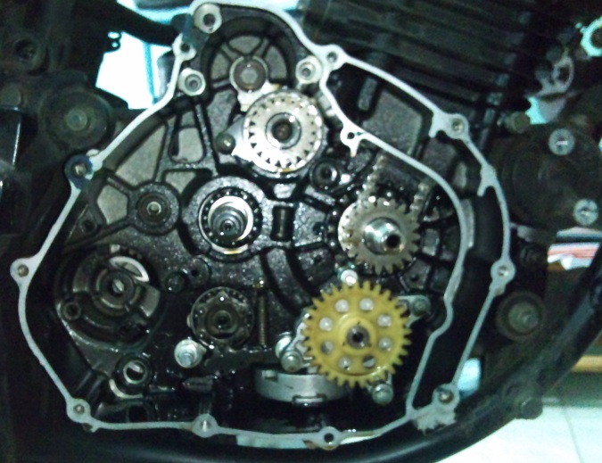 8. Ketemu potongan baja, nyelip diantara bandul dan crankcase. Ternyata gir gigi-2 countershaft rompal