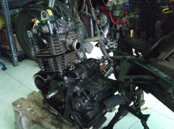 Sampai pada tahap pelepasan bak kopling dan bak magnet [artiekl terdahulu 1, 2], belum terlihat indikasi penyebab gangguan mesin. Pas ada waktu cukup luang (minggu pagi), ane lanjutkan pembongkaran mesin p180ug4, yang seharusnya memasuki tahap penurunan mesin dari rangkanya.