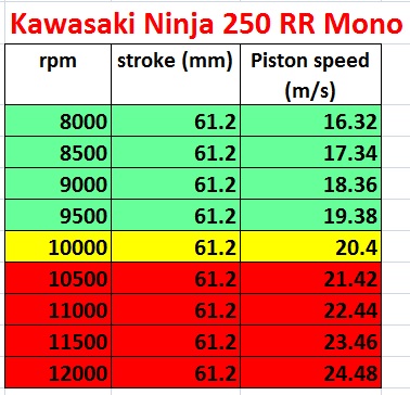 Jika diperhatikan posisi redline speedometer-nya yang berada di 10500 rpm,  dimana piston speed-nya 21.42 m/detik, sudah melebihi batas maksimum harian. Hal ini menunjukkan bahwa kualitas ring-piston dan silinder rr mono ini tidak main2, kelas atas bro (mungkin sudah dilapisi nikasil).
