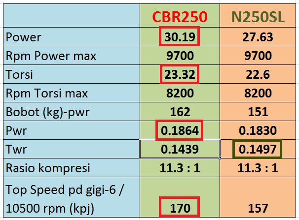 Dari tabel di atas terlihat kelebihan n250sl dibandingkan cbr250 terkait dengan power lebih besar dan bobot yang lebih ringan, sedangkan kelebihan cbr250 terkait dengan torsi dan rasio transmisi. Terlihat juga potensi terpendam pada mesin cbr250 yaitu :