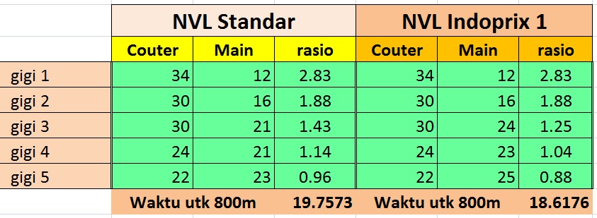 Jika rasio akhir dijadikan 42/15, maka keluar tikungan bisa dengan kecepatan 90 kpj dan stright 800 meter dapat ditempuh dalam waktu 17.025 detik dengan topspeed sebelum pengereman 210 kpj, ini baru mantab. Inilah hasil akhir racikan rasio transmisi NVL 5-speed (NVL Indoprix 3, versi motogokil) dengan gir depan 15 dan gir belakang 42. Berikut grafik performanya