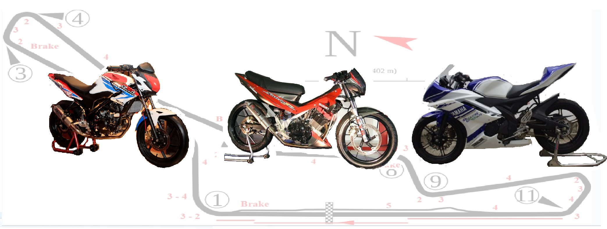 Karena trek lurus sirkuit yang akan dipakai pendek2 ane rasa 5-speed masih bisa ngimbangin 6-speed, sehingg yang jadi penentu adalah kecepatan masuk dan keluar tikungan dalam perolehan laptime yang kecil. Performa di tikungan ini sangat dipengaruhi oleh handling motor dan gaya balap racer (pembalap). Mengenai gaya balap para racer, nggak usah diomongin, karena susah untuk dianalisis, tapi mengenai handling motor mungkin bisa diprediksi dengan melihat beberapa variabel seperti, jarak sumbu roda, trail, sudut rake, sudut putar, radius putar dll.