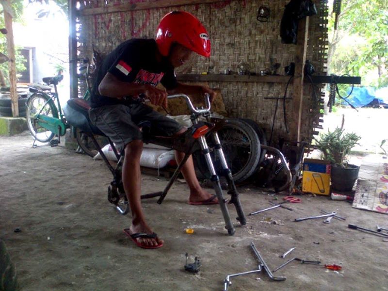 Kadangkala modif seperti ini banyak mengeluarkan biaya, oleh karena itu sebelum membeli motor ada baiknya ergonomi di-tes dulu, bahkan sebelum motor jadi, masih dalam bentuk rangka, seperti ini tesnya…00 pengujian ergonomi