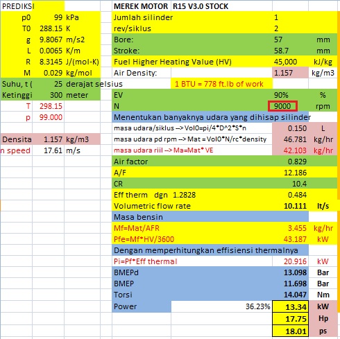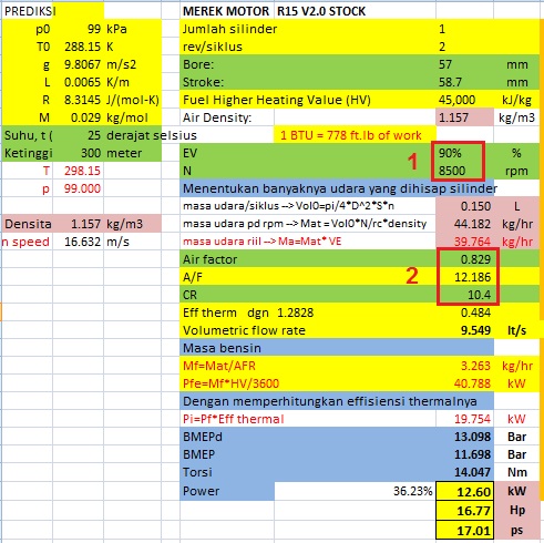 Jadi untuk menaikkan power dari 17 hp menjadi 18 hp tentunya mudah saja, yaitu dengan mengubah mapping penginjeksian dan pengapian, asalkan kurva efisiensi volumetrik sudah mendukung. Mari kita lihat perubahan powernya dengan mengubah faktor2 penentu power di atas.