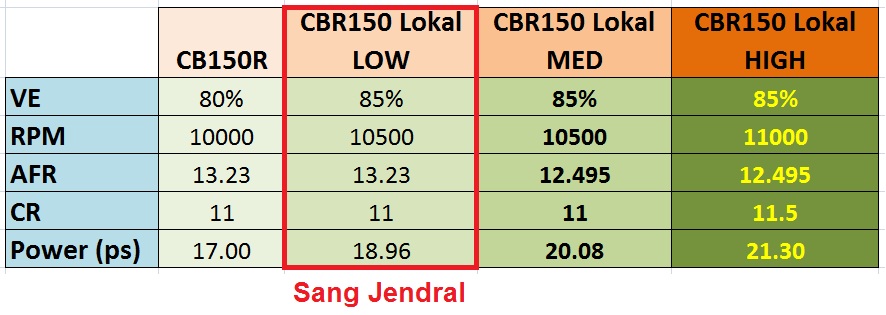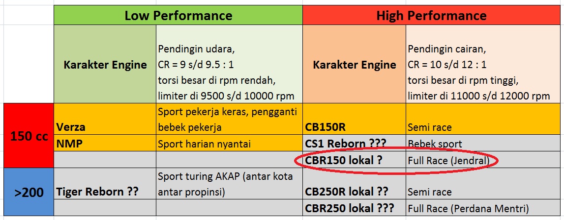 Jadi melihat konstelasi ini bisa diperkirakan bahwa bentuk, performance, ergonomi dari “Sang Jendral” , cbr150 lokal, adalah murni sport. Apalagi jika memperhatikan sinyalemen bahwa akan ada modifikasi ECU dan penggunaan ban gambot, maka bisa diprediksi bahwa powernya lebih besar dari cb150r. Jika sang jendral difungsikan sebagai penggempur sport high performance kompetitor, kira2 spek enginenya adalah :
