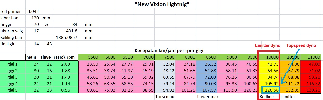 Dengan kombinasi body old vixion dan engine nvl maka akan terjadi peningkatan topspeed yang sebelumnya topspeed nvl adalah 126.56 kpj pada 10000 rpm.