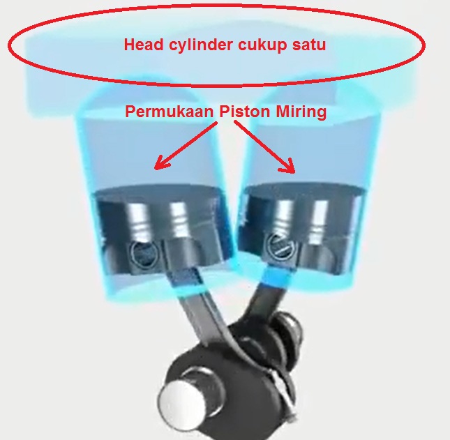 4. Bentuk permukaan piston dimodifikasi “miring” agar cukup menggunakan 1 head cylinder, sehingga mengurangi bobotnya