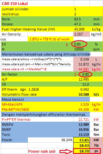 Dengan sedikit meng-upgrade nokenas, box filter akan bisa menaikkan efisiensi volumetrik sekitar 5% (1). Dan dengan upgrade ECU, mapping pengapian dan volume bbm yang injeksikan AFR bisa di-set pada 12.495 (lebih boros sedikit). Dan power yang dihasilkan dapat mencapai 18.7 ps, lumayan naik 1.7 ps, dan ini sangat mudah bagi ahm.