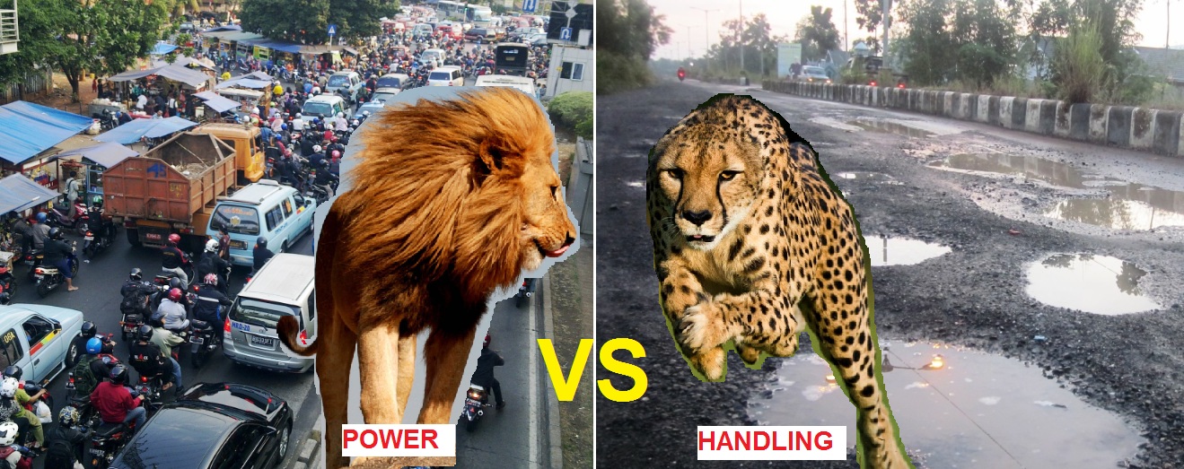 pilih yang torsiya besar dong,kalo handlingnya bagus emang mau ngindarin lobang gede mulu?walaupun lagi high speed? :P.kalo torsi badak kan kalo macet bisa jalan diatas mobil 😛