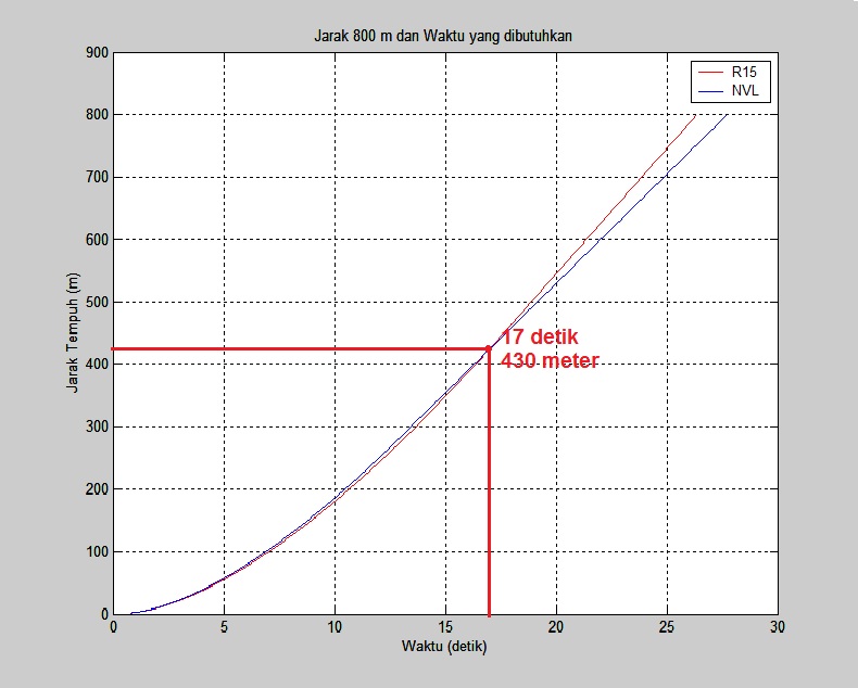 Jadi mulai dari start sampai 12 detik kemudian, akselerasi masih menang NVL, setelah itu R15 yang unggul. Dan R15 mulai bisa menyalip pada detik ke 17 dan pada jarak 430 m seperti gambar berikut