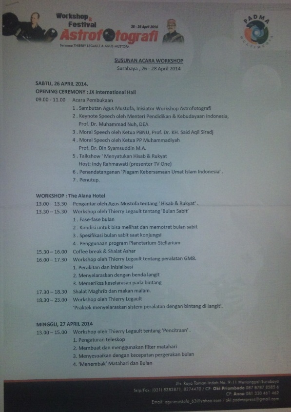 Mulai tadi pagi, sampai Senin siang, ane ditugasin ikut workshop ini, “Astrofotografi”, yang sama sekali bukan bidang ane. Hal ini terkait dengan akan dihibahkannya sebuah alat pemantau bulan yang berguna untuk menentukan awal dan akhir bulan romadhon. Penggagas acara ini adalah penulis kondang “Agus Mustofa” yang tergugah hatinya untuk ikut membantu umat Islam dalam menentukan awal dan akhir bulan puasa. Sehingga umat Islam bisa lebih nyaman dalam menunaikan ibadah puasa, karena mulai puasanya bersama, idul fitri nya juga bersama.
