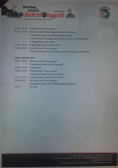 Mulai tadi pagi, sampai Senin siang, ane ditugasin ikut workshop ini, “Astrofotografi”, yang sama sekali bukan bidang ane. Hal ini terkait dengan akan dihibahkannya sebuah alat pemantau bulan yang berguna untuk menentukan awal dan akhir bulan romadhon. Penggagas acara ini adalah penulis kondang “Agus Mustofa” yang tergugah hatinya untuk ikut membantu umat Islam dalam menentukan awal dan akhir bulan puasa. Sehingga umat Islam bisa lebih nyaman dalam menunaikan ibadah puasa, karena mulai puasanya bersama, idul fitri nya juga bersama.