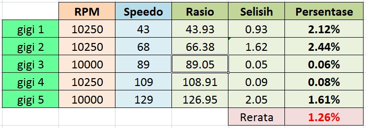 Melihat dari hasil pengujian topspeed per gigi yang dilakukan oleh Mas Taufik dan membandingkannya dengan kecepatan per gigi sesuai dengan rasio gigi2nya menunjukkan hasil yang mendekati akurat, menakjubkan ! Hampir sama dengan riilnya.