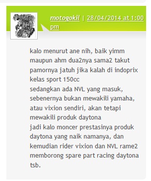 Beberapa minggu yang lalu, daytona yang mengembangkan NVL indoprix berhasil meraih podium. Tentunya sangat membangkan baik bagi pemilik vixion maupun tim daytona. Dari even tersebut ramailah dunia maya, di mana FBY dan FBH saling mengejek, karena cb150r tidak ikut sedangkan nvl ikut indoprix meskipun hanya tim privateer.