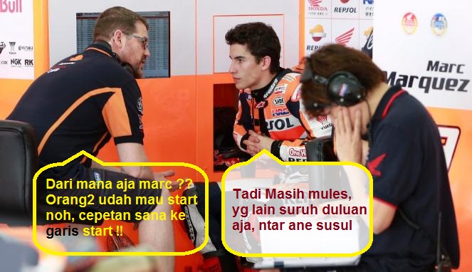 Musim motogp 2014 sudah masuk balapan ke-4, yang mana semua pole position diduduki Marc Marquez, begitu pula dengan podium 1, semua MM. Bisa jadi dorna sudah mencium bau tidak sedap akan pudarnya pamor motogp, gara MM terlalu dominan. Untuk mengatasinya dorna mebisikan ke telingan MM sebuah permintaan, dan salah satu akibatnya adalah MM tidak nampak di garis start (gambar dia atas).