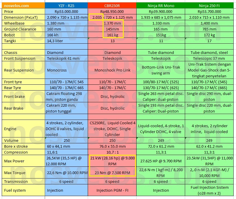 Jika persaingan dilihat dari performanya di jalan umum, maka akan sangat jelas sekali keunggulan cbr250 diantara rival-rivalnya. Perhatikan spesifikasi yang di kotak kuning.