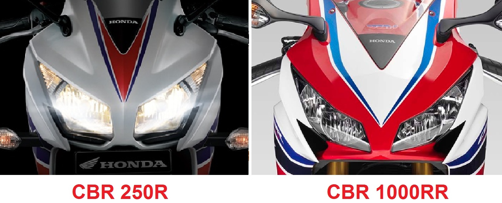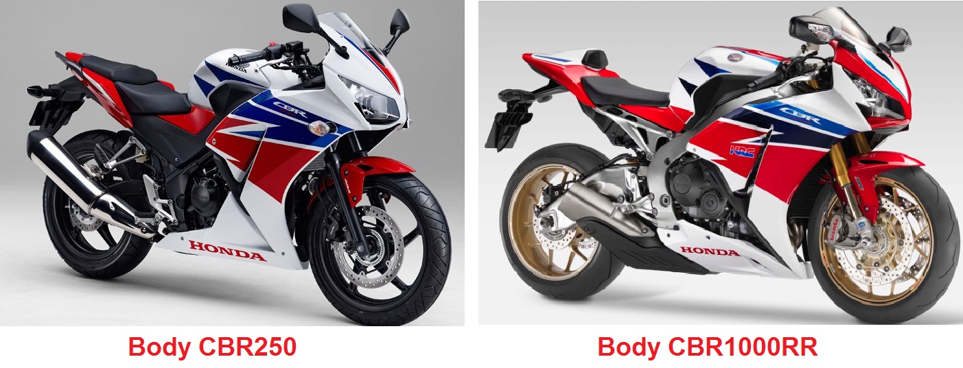 Nah ini dia, kebetulan filosofi honda dan hasil survei di pasar motor sport honda terbesar (eropa dan amerika) menginginkan model seperti yang ada sekarang. Dan ternyata (mungkin) nggak cocok dengan minat calon pengguna di Indonesia, sehingga model-model motor sport honda terlihat kurang agresif, ke-bapak2-an, bahkan ada yang bilang jelek. Tapi jika kita mau membandingkan model cbr250 dengan model motor honda lain di atasnya, maka memang segaris. Bagi siapapun fanboy yang suka dengan penampilan cbr1000rr 2014, maka akan tampak modelnya pada cbr250. Jadi benar adanya jika dinyatakan cbr250 adalah baby-fireblade, coba perhatikan perbandingannya…Penampakan headlamp