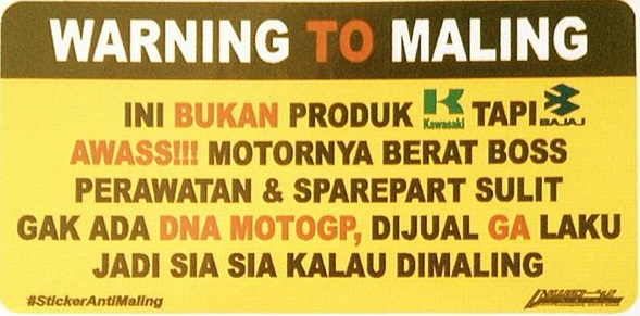 Jadi selain membuat maling berpikir 100x untuk nyolong motor kita, stiker ini juga membuat maling pintar atau berusaha untuk pintar. Mudah-mudahan malingnya lanjut ke warnet bukan mau mencari sasaran lain, tapi nyari info tentang motor produk bajaj, kelangkaan sparepart-nya, dna motogp dll, jadi pinter deh malingnya.