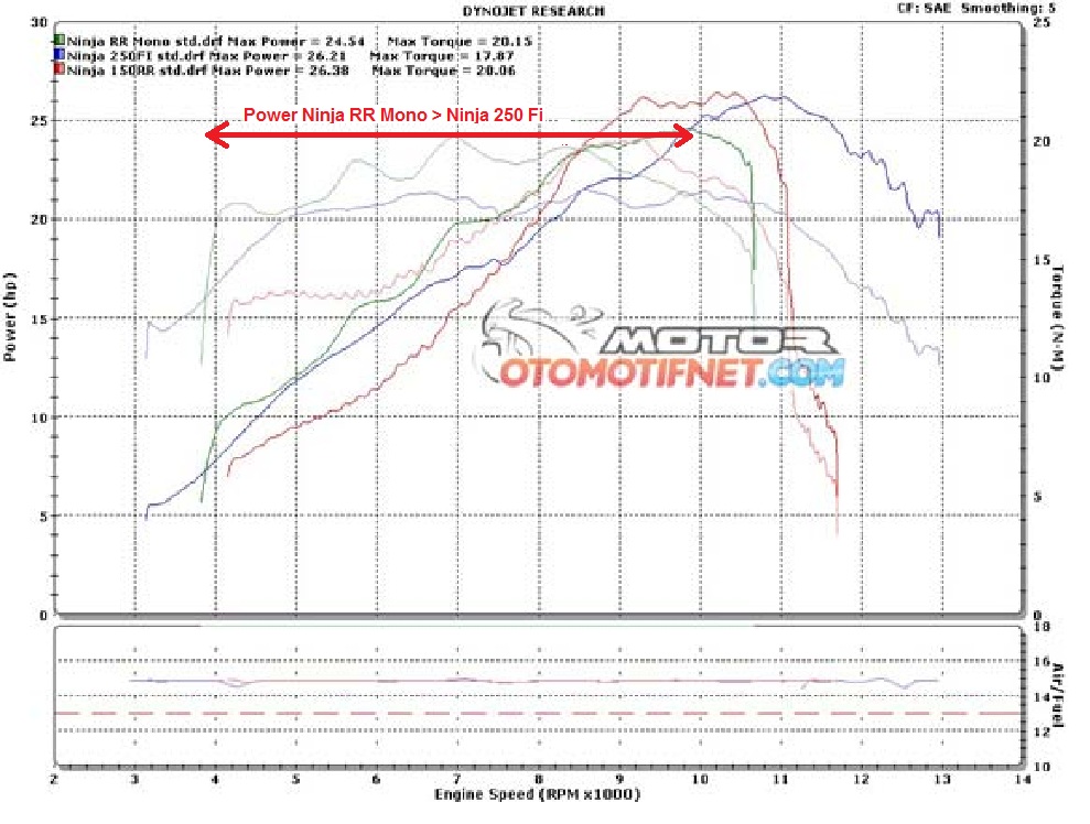 Terlihat power ninja rr mono mulai dari rpm rendah sampai 9800 mampu mengungguli ninja250fi. Kemudian setelah 9800 rpm berbalik ninja250fi mengungguli rr mono. Dengan kondisi seperti ini silahkan berimajinasi kira-kira disentul menang mana antara ninja250fi, ninja rrmono dan yzf r25.
