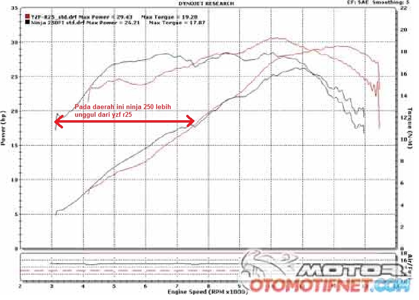 -power band R25 >7500rpm jauh lebih superior namun diragukan bisa menang di sentul (grafik 1)