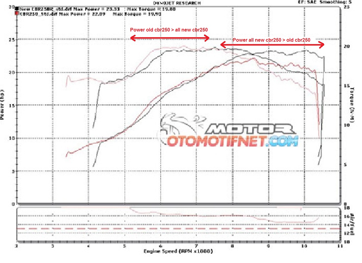 Pada grafik kurva power/torsi terlihat old cbr250 mampu mengungguli ninja250 sampai 9000 rpm, setelah itu ninja250 lebih unggul.Dan ketika dibandingkan dengan all new cbr250, ternyata kurva pada rpm rendah sedikit berbeda (old cbr250 lebih tinggi) sedangkan pada rpm tinggi all new cbr250 lebih unggul