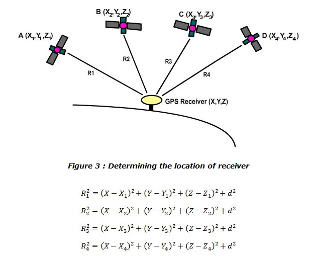 Dari posisi satelit (x1,y1,z1) dan waktu akan diketahui radius di permukaan bumi yang memiliki jarak yang sama dengan satelit 1, begitu pula dengan satelit lainnya. Jika memperhatikan data dua satelit maka akan ada dua posisi yang mungkin bagi user