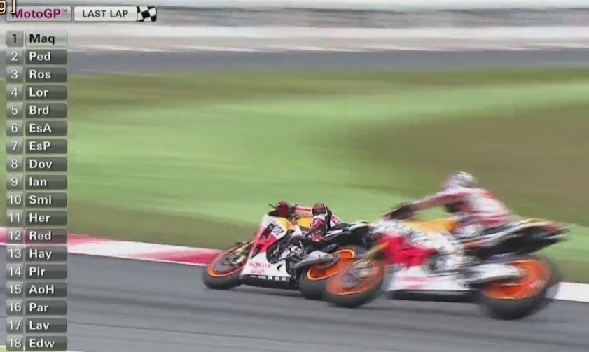 DP dengan bobotnya yang lebih enteng sepertinya akan mampu meng-overtake di tikungan terakhir, dan memang jika berhasil, meskipun dalam kondisi sejajar saat keluar tikungan, ane yakin DP dapat juara di catalunya dengan selisih beberapa puluh milidetik daripada MM. Sayang terjadi senggolan antara ban depan DP dan ban belakan MM, yang menyebabkan DP melebar. VR yang posisinya tepat dibelakang DP, mengambil kesempatan untuk menyodok ke depan menempati urutan kedua, sampai finish.