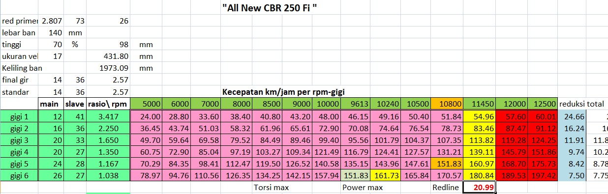 Dari bobot reduksi terlihat ninja250fi yang paling ringan, kemudian rrmono, r25 dan terakhir yang paling berat adalah cbr250. Oleh karena itu kecepatan pada “rpm yang sama” yang memiliki reduksi total yang paling berat lah yang paling kencang, yaitu cbr250. Perhatikan tabel topspeed masing-masing motor pada rpm yang sama berikut