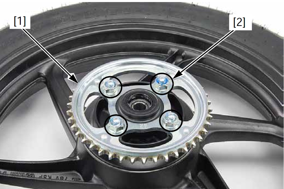 Kendurkan mur as roda [1] kemudian kencangkan mur penyetel ketegangan rantai [3], selanjutnya lihat skala pengukur [4] baik sisi kiri dan kanan swing arm. Kalau posisi skala/garis sudah sama maka kencangkan mur as roda, dan kunci mur penyetel dengan mur kedua [2]. Adapaun cara menentukan ketegangan rantai adalah dengan mengukur saat rantai diam dan saat ditegangkan, ukurannya 2.5 cm sampai 3 cm