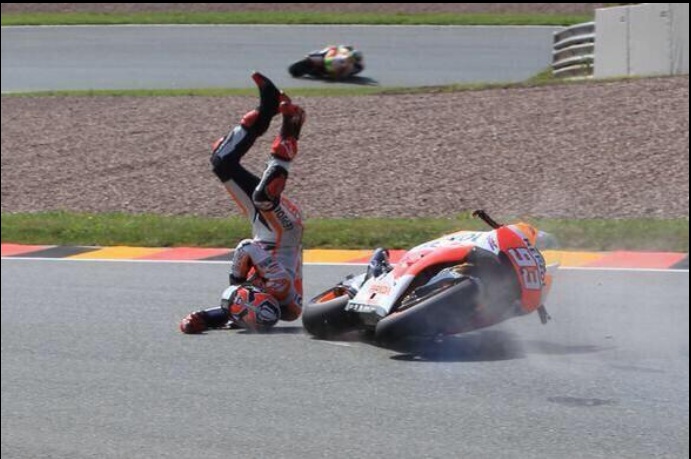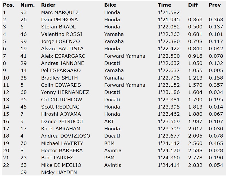 Baru kemarin Marc Marquez (MM) jungkir balik di FP1, sekarang MM malah menempati posisi 1 pada FP4, sekaligus menembus batas 1 menit 22 detik (1 menit 21.582detik).  Bener-bener edan, rupanya jatuhnya MM kemarin merupakan batas kemampuan MM+RC213V untuk melibas tikungan-tikungan tersebut.