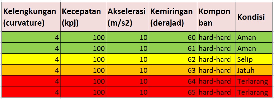 Misalnya, jika beberapa kondisi berhasil yang disimpan dalam data logger, maka dari semuanya bisa ditabelkan hubungan antara variabel-variabel dan kondisi motor di tikungan.