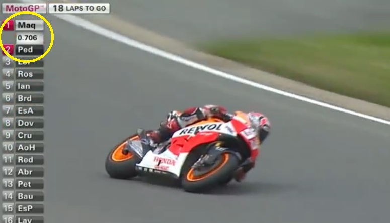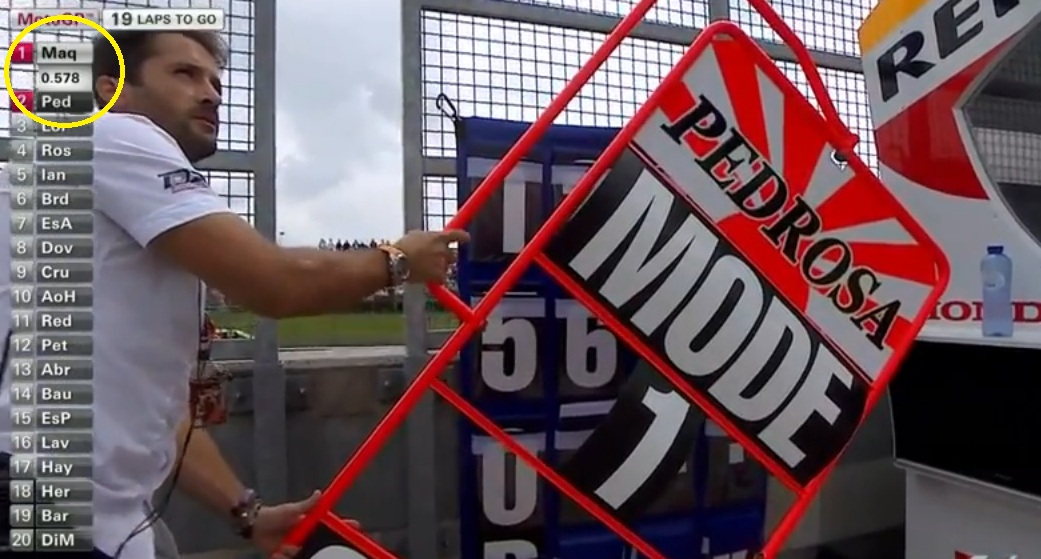Masih ada yang tersisa dari race di sachsenring kemarin. Terlihat bahwa pada pertengahan race, performa pedrosa begitu powerfull. Bahkan semakin lama semakin medekati marquez, sampai selisih waktunya tinggal 0.578 detik. Kemudian setelah tim mengeluarkan “Mode 1”, tiba-tiba selisihnya bukan mengecil tapi malah bertambah menjadi 0.706