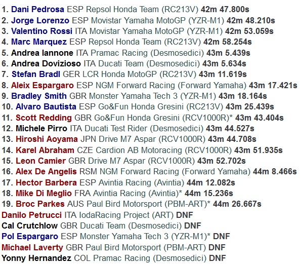 Akhirnya Marquez kalah juga kali ini. Terlihat bahwa motornya mm kalah topspeed saat lurus, dan ketika menikung sering melebar. Kayaknya ada masalah di roda belakangnya, kalo melihat ban belakangnya rada ancur, mungkin itu yang bikin mm kedodoran. Sayangnya Lorenzo nggak mampu menempel Pedrosa, sehingga tidak terjadi pertarungan seru selama race. Ya mirip kayak kemaren, tapi yang menang sekarang Pedrosa.