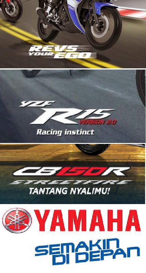 dari tagline itu kebanyakan dari yamaha yang ngajarin kebut2an. hadeh. keliatan kalang kabut nih pabrikan. jurusnya wes gak ada lagi. yaitu ngajarin ngebut. biar produknya laku . gak matic gak bebek plus sportnya juga. iklane pada dibuat ngebut